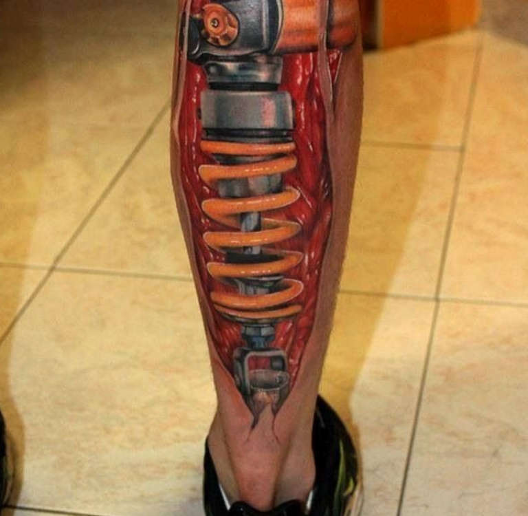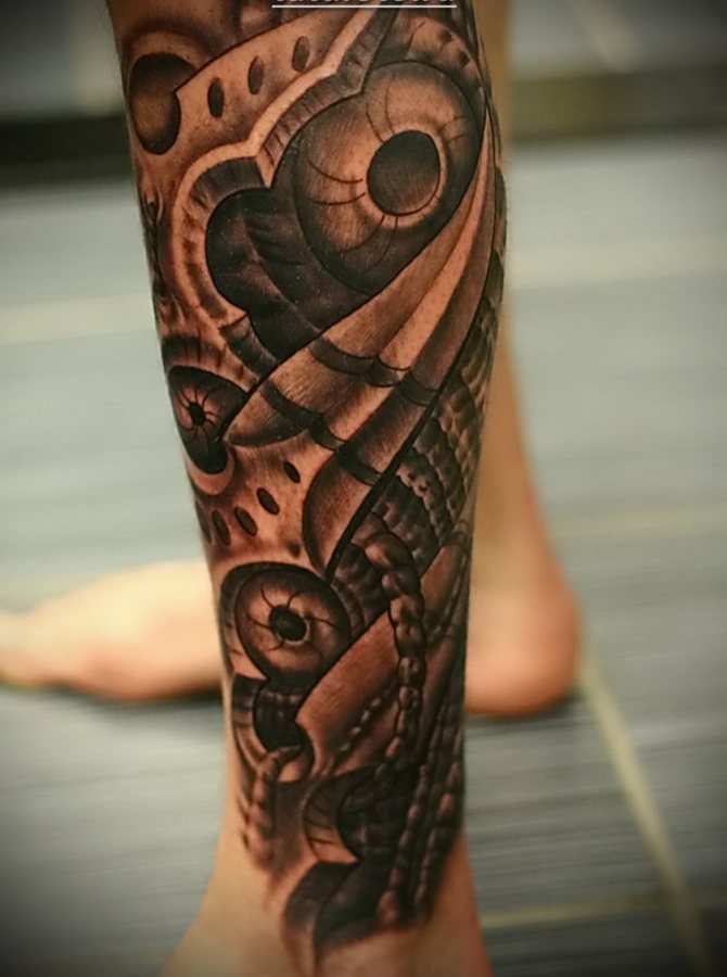 - Био-органични. Имитира вътрешната структура. Най-често тези татуировки представляват мускули, кости, кръвоносни съдове. При избора на татуировка в стила на биомеханиката картината завършва изкуствени елементи: бутала, зъбни колела, жици.