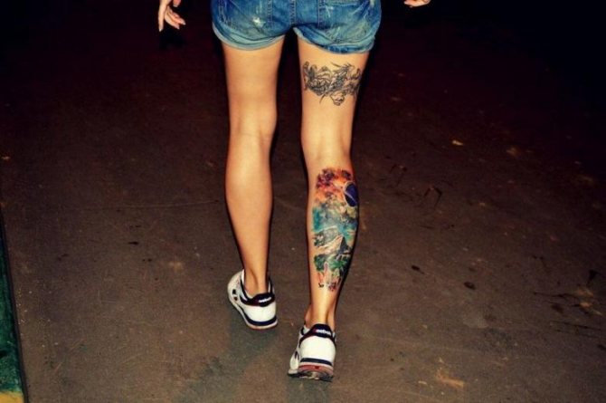 Татуировките на женски прасци са чудесен начин да подчертаете красотата на краката си или да коригирате техните несъвършенства. Самите телета са изправени и имат завършена, завършена визуална ос - центъра.