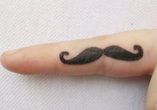 Пръстът с татуировката се доближава до пространството между носа и горната устна, за да се получи забавна снимка. Малко по-късно оригиналната татуировка стигна до нас. Днес популярността на "мустаците" малко е спаднала, но те все още са често избиран дизайн за рисуване с пръсти. Това е може би класически пример за модата на дадена татуировка.