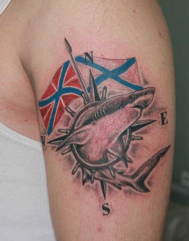 Акулата е друг елемент от татуировката, който често се използва от моряците. Хищникът символизира безстрашие, сила, стремителност и способност за оцеляване. Мечката символизира готовността да се изправиш смело срещу опасността.