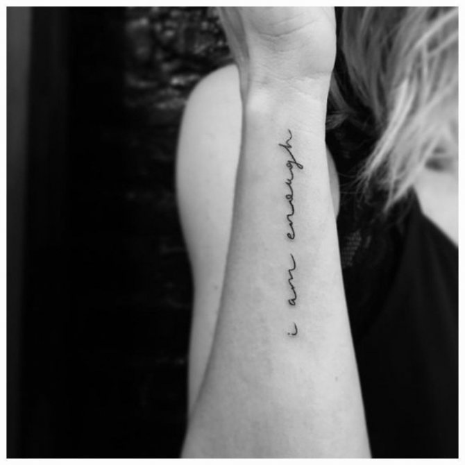 Надписите върху татуировките са особено популярни сред момичетата. Тази татуировка изглежда минималистично и ви позволява да уловите важни фрази и думи върху тялото си.
