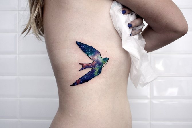 Татуировката на птица върху ребрата може да бъде изобразена в почти всякакъв стил - от минималистичен до старомоден или акварелен. Най-често срещаните са изображения на сови, лястовици и колибрита. Но когато избирате птица, не забравяйте, че всяка птица има свое собствено значение, което е най-добре да научите предварително.