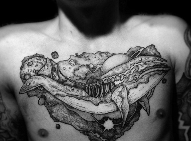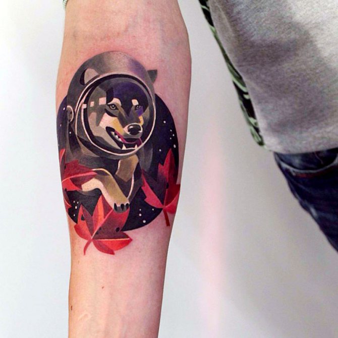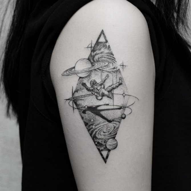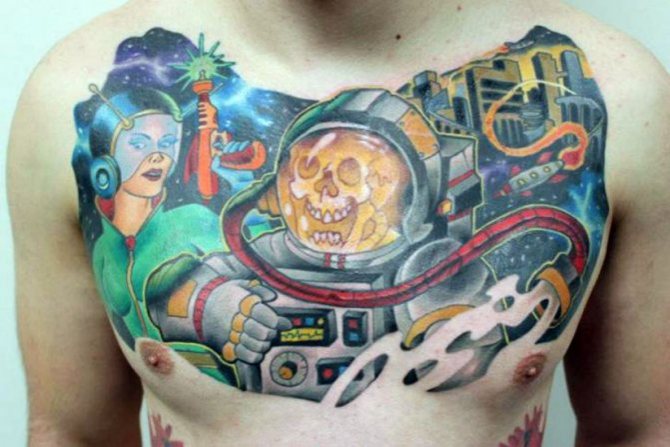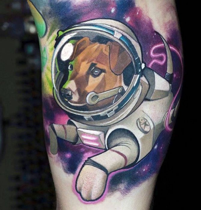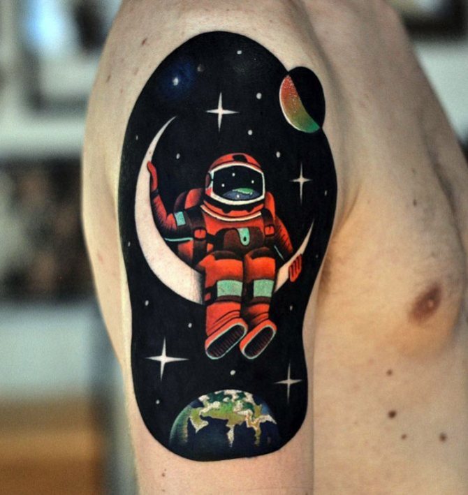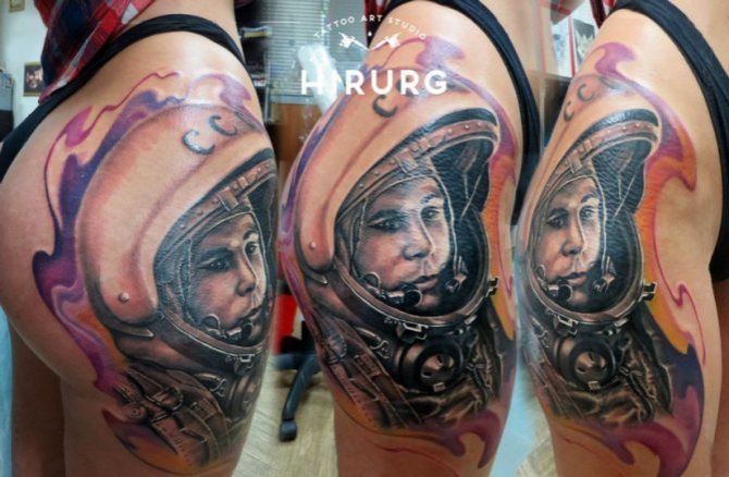 Със своята неизследваемост и загадките на необятното пространство интригува хората от древни времена. Татуировката на астронавта, с портрет на конкретен изследовател, модерен в средата на миналия век, изглеждаше на ръката не особено ярка, предимно в синьо.