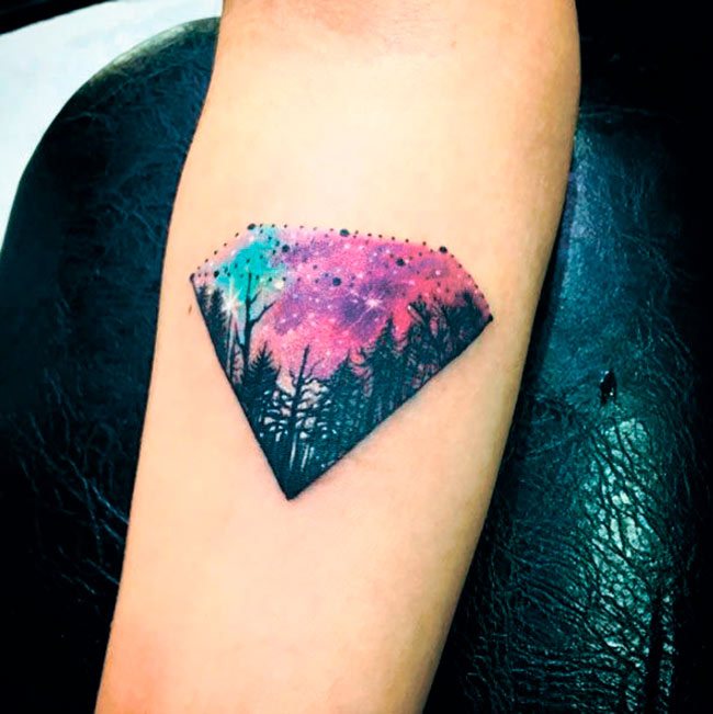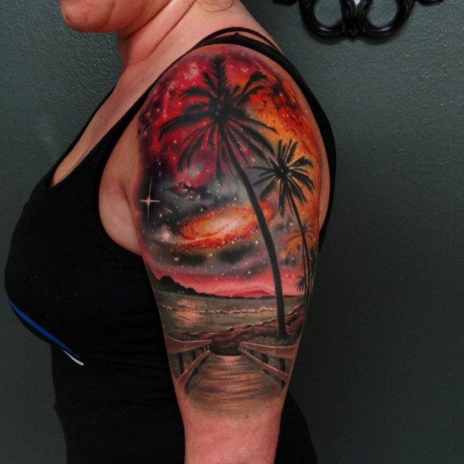 За татуировка в триизмерен реалистичен стил ще е необходима цялата ръка, за да се детайлизират фрагментите на платното. Фантастичният пейзаж на космическа тематика може да се разшири до областта на лопатките с плавен преход към областта на гърдите. В този случай контурите на ръката са подчертани с цвят.