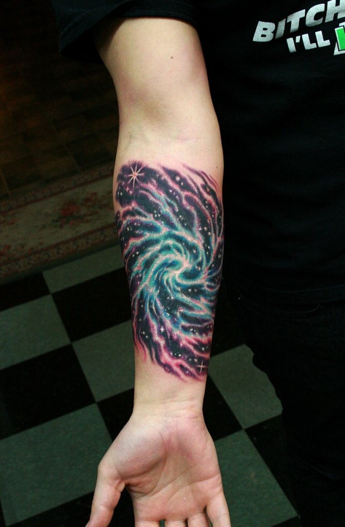 Опровергаването на факта, че пространството е изпълнено само с ирационални хора, е символиката на самата вселена. Въпреки малкото изследване на безграничното пространство, то често се свързва с ред, нещо цялостно, завършено. А известният философ Платон веднъж дори го приравнява с човека. Сложната структура на галактиката му се стори подобна на човешкото съзнание. От това можем да заключим, че притежателите на космическата татуировка преди всичко търсят хармония със света в себе си. Искат да усетят и да видят в огледалото своето вътрешно "аз". И едва след това са мечтите.