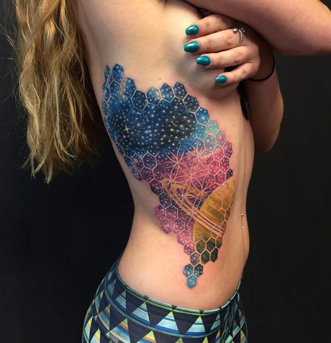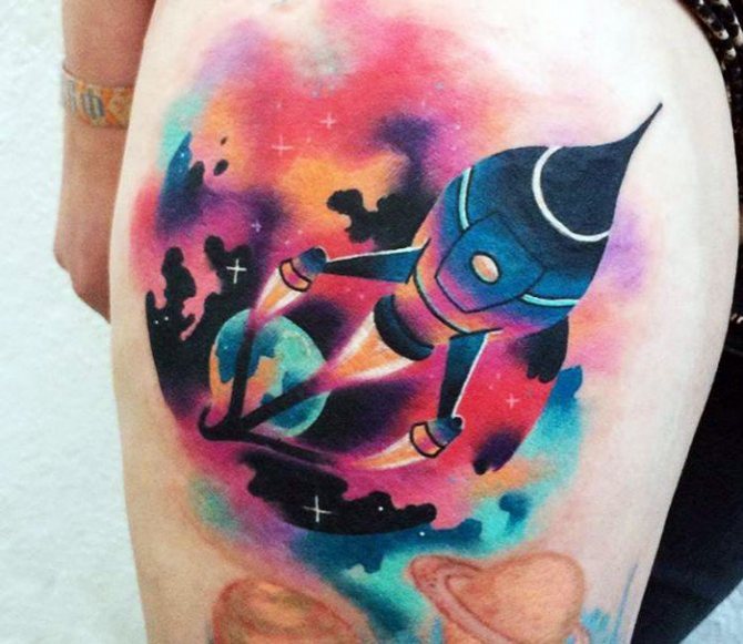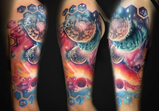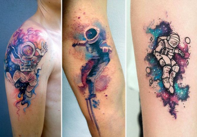 Особено хипнотизиращи са космическите сюжети, изпълнени в цвят и допълнени от изображение на небесни тела. В този случай към общото значение на цветната татуировка се добавя скрит смисъл - романтиката на душата, за която фантазията е по-висша от реалността. Ето защо скиците на космическа тематика се избират от творческите натури, за да разкажат на другите за своите хобита. Например астронавт без лице, но държащ китара, може да бъде видян върху тялото на музикант.