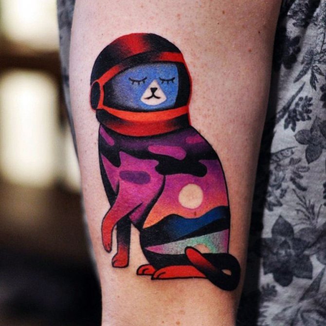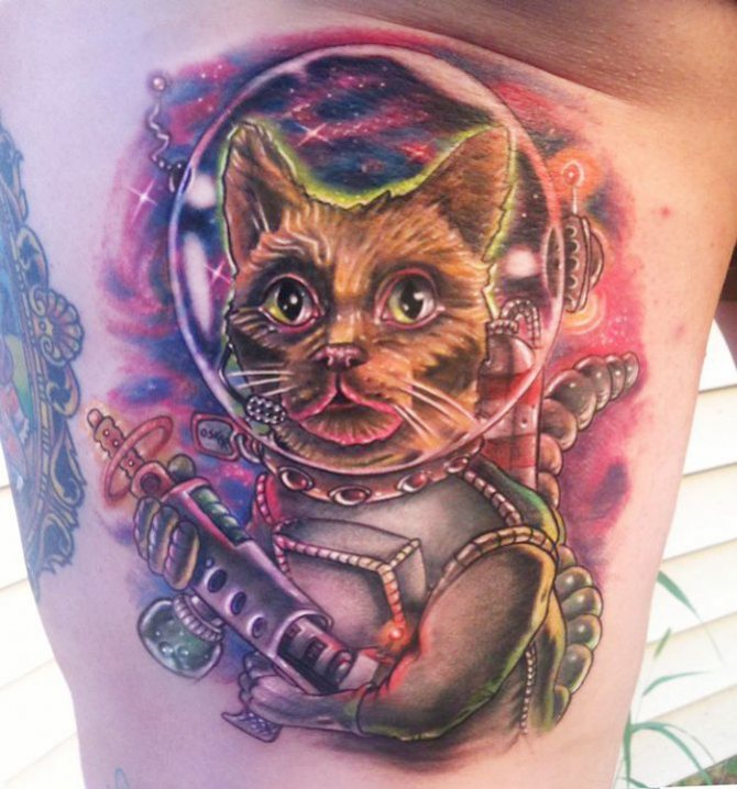 Топлите усмивки предизвикват татуировката на котка астронавт, която мечтателно гледа към пространството, изглеждат интересни отпечатъци на изкуствен спътник или ракета, станцията "Мир" или космическия кораб "Восток". На ръката на мъжа обаче образът на астронавта често е фрагмент от хипнотизиращата композиция в татуирания ръкав.