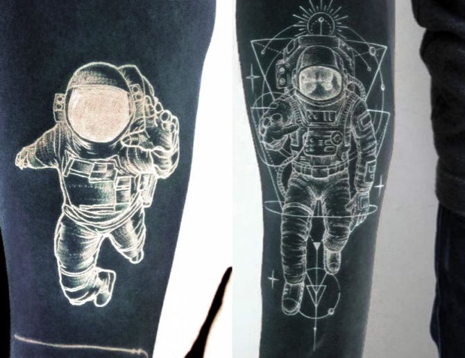 Татуировката на астронавт върху ръката или други части на тялото понякога се превръща в истински шедьоври на татуировката благодарение на правилния избор на скицата, написана от опитния татуист.