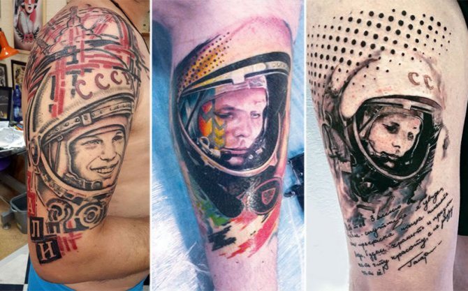 За мъжката аудитория татуировката се характеризира с по-големи размери. Тези скици обаче не предизвикват приятни емоции. Отпечатъкът от портрета на Гагарин, подкрепен от известната му фраза "Да тръгваме!", може да се види върху тялото на пламенните руски патриоти. В този случай краткият иконичен подпис се тълкува като девиз, който насърчава носителя да върви напред по избрания път.