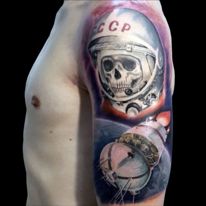 В съветската епоха татуировката е символ на неосъществената мечта да станеш член на ескадрилата на завоевателите на вселената. Смисълът на портрета на истински космонавт в шлем е свързан с уважението към родината, тъй като шлемът е украсен с големи букви от името на страната - СССР.