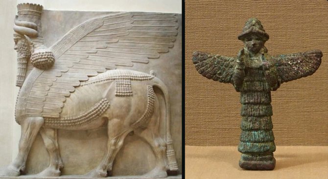 Огромните духове-пазители служели за пазачи на храмовете и дворците на владетелите в древна Месопотамия. Образът им произлиза от шумерската богиня Ламма (вдясно). Вдигнатите ѝ ръце символизират молитвата на смъртните към боговете.
