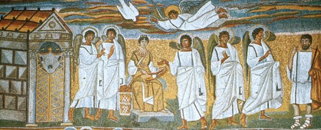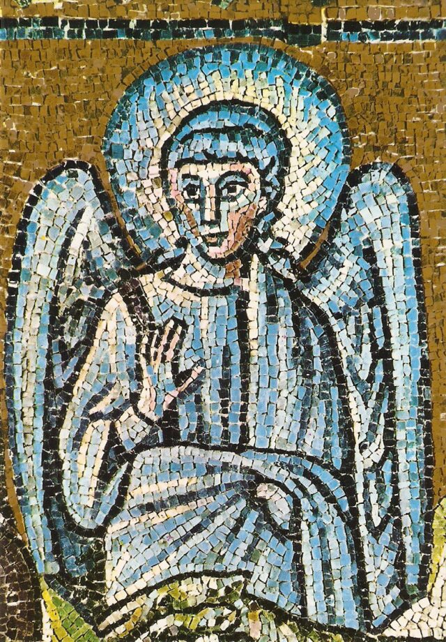 Мозайка на Благовещението на Дева Мария, поръчана от папа Сикст III през 432 г. В оригиналния чертеж ангелите нямат крила.