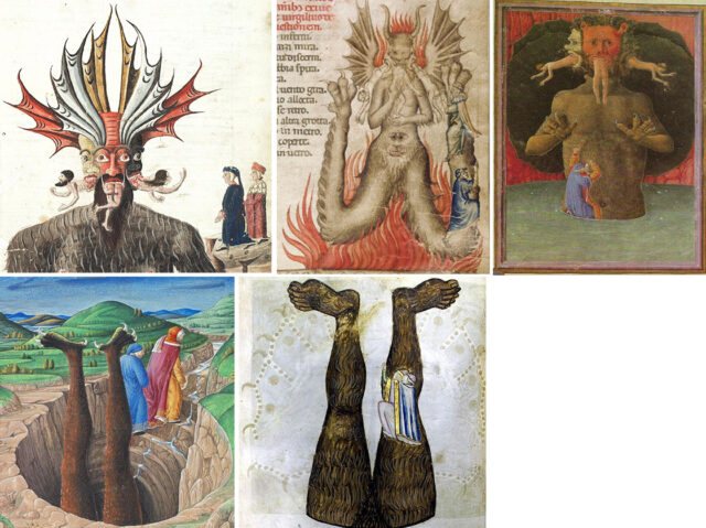Сатаната все по-често е изобразяван като страдащ - дори когато самият той измъчва грешниците в ада. Ръкописът на "Огледалото на човешкото спасение", създаден в Каталуния през 30-те и 50-те години на XIV в., изобразява вързания дявол с две усти: втората е в разкрача и дъвче обитателя на подземния свят с остри кътници със застинала гримаса на ужас. Още две муцуни израстват направо от коленете му, а отдолу има птичи или жабешки лапи с дълги нокти.