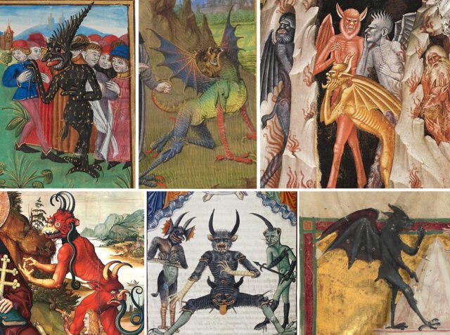 Късносредновековният дявол става все по-екзотизиран и гротесков. Многоцветните (понякога всички наведнъж) и многообразни прислужници на Сатана не изостават.