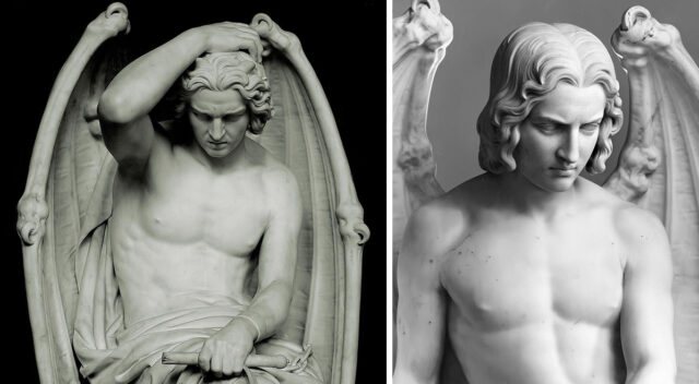 Един от най-сексапилните образи на Сатаната е създаден през 1842 г. от белгийския скулптор Йозеф Гефс за катедралата в Лиеж. Неговият "Гений на злото" е гол младеж с крила на прилеп.