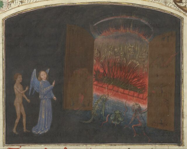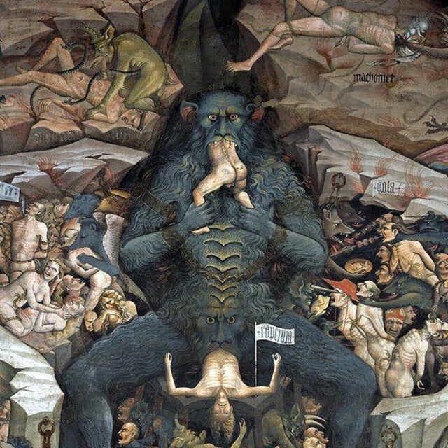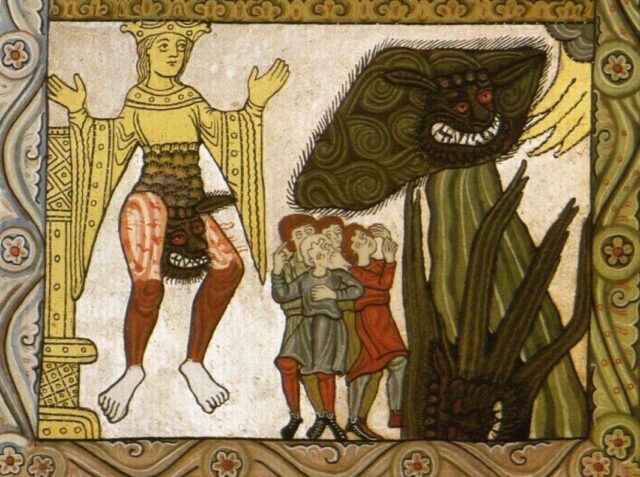 Сатаната все по-често е изобразяван като страдащ - дори когато самият той измъчва грешниците в ада. Ръкописът на "Огледалото на човешкото спасение", създаден в Каталуния през 30-те и 50-те години на XIV в., изобразява вързания дявол с две усти: втората е в разкрача и дъвче обитателя на подземния свят с остри кътници със застинала гримаса на ужас. Още две муцуни израстват направо от коленете му, а отдолу има птичи или жабешки лапи с дълги нокти.