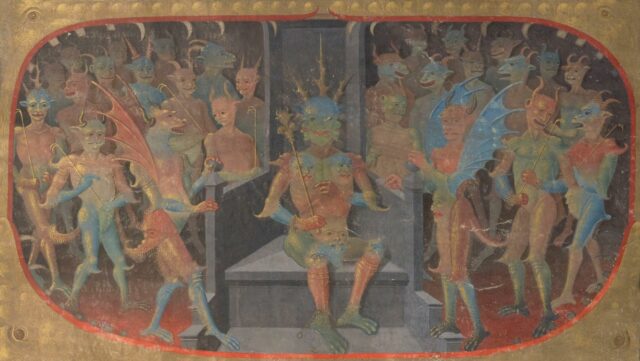 Във френските морализирани Библии от XIII в. и в по-късните ръкописи три- или седемликият Сатана или Антихрист често седи на трон, мечът му е огромен, а короната му е покрита с тръни, което разкрива истинската същност на неправедния цар. Заради желанието си за рационализация, структура и йерархия миниатюристите рисуват дявол, който царува в подземния свят така, както Бог царува на небето.
