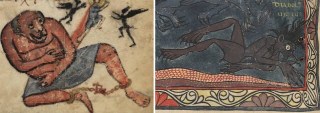 Английският ръкопис от XI в. показва Дявола в съвсем различен вид: той е великан с космат гръб (в текстовете от онова време косата му се сравнява с огнени езици) и разрошена прическа, без нито една животинска черта. От друга страна, не е толкова лесно да се види нещо човешко във фигурата на Сатаната от испански коментар на Апокалипсиса (XI в.) - краката и ръцете му са снабдени с остри нокти и приличат по-скоро на животински лапи, отзад стърчи къса опашка, а носът му прилича на клюн. Последният детайл не е случаен - по онова време евреите са били изобразявани като грозни и любопитни и авторът вероятно е искал да направи този визуален паралел. Черни, сиви, кафяви, сини или лилави - на Сатаната с неговите цветове на нощта и болестта се противопоставят червени или бели ангели, въплъщение на небесния огън и Божията светлина.