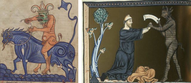 Дяволът с форма на паница в миниатюра от известния Псалтир на кралица Ингеборга приканва светеца Теофил Киликийски от VI в. да сключи сделка с него. Той се съгласява и те сключват специален договор (днес историците действително намират в архивите договори със Сатаната, написани с кръв). По-късно, след като се разкайва, Теофил моли за прошка Дева Мария, която нарушава споразумението.