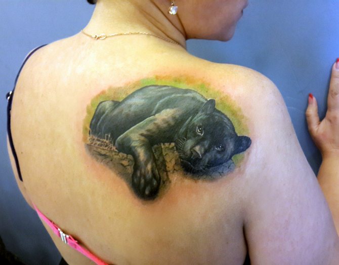 Обикновено, когато става дума за татуировка с пантера, хората си представят черно животно - Багира от известната приказка за Маугли. Но има и жълта пантера - макар че всъщност е ягуар.