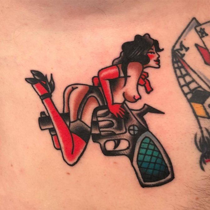 Образът на оръжието отдавна е противоречив. На пръв поглед пистолетът се смята за опасно огнестрелно оръжие, но татуировката, изобразяваща пистолет, често се избира от нежния пол. Пистолетът, скрит зад смела и красива жартиера, ще говори за игрив и забавен характер. Въпреки това, татуировка на пистолет върху тялото на момиче, дори и с различни допълнения под формата на цветя, панделки и модели, ще ви каже, че носителят на такава татуировка не винаги ще бъде приятен, ако е необходимо, тя може лесно да се изправи за себе си.