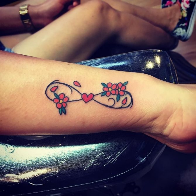 Една от най-популярните композиционни комбинации. В този случай татуировката безкрайност на китката показва силна връзка между двама души. Ако имате любим човек, на когото сте предани с тяло и душа, и искате да изразите любовта си (но не искате да използвате имена), това е идеалният избор.
