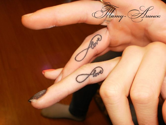 Популярният символ на вечното движение често се поставя от влюбените двойки на безименния пръст като татуировка. В този случай символът на безкрайността може да означава силата и вечността на чувствата. Той често се използва вместо годежен пръстен. Дамите предпочитат да нанасят въпросния дизайн в малък размер отстрани на пръста. Тази татуировка изглежда много спретната, деликатна, но в същото време носи дълбоко значение за собственика си.