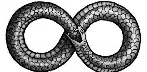 Красивата, кратка и универсална татуировка "безкрайност", която прилича на самоизяждаща се змия или дракон, изразява житейската философия на притежателя си. Също така значението на татуировката говори за богатото вътрешно съдържание на човек, който е положително настроен към света около него.