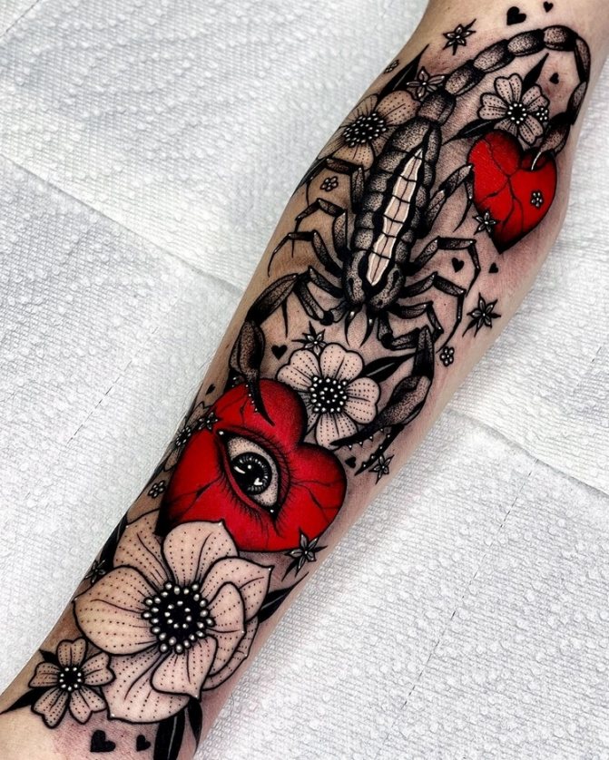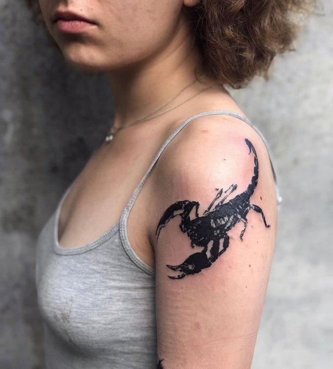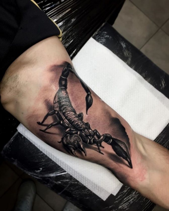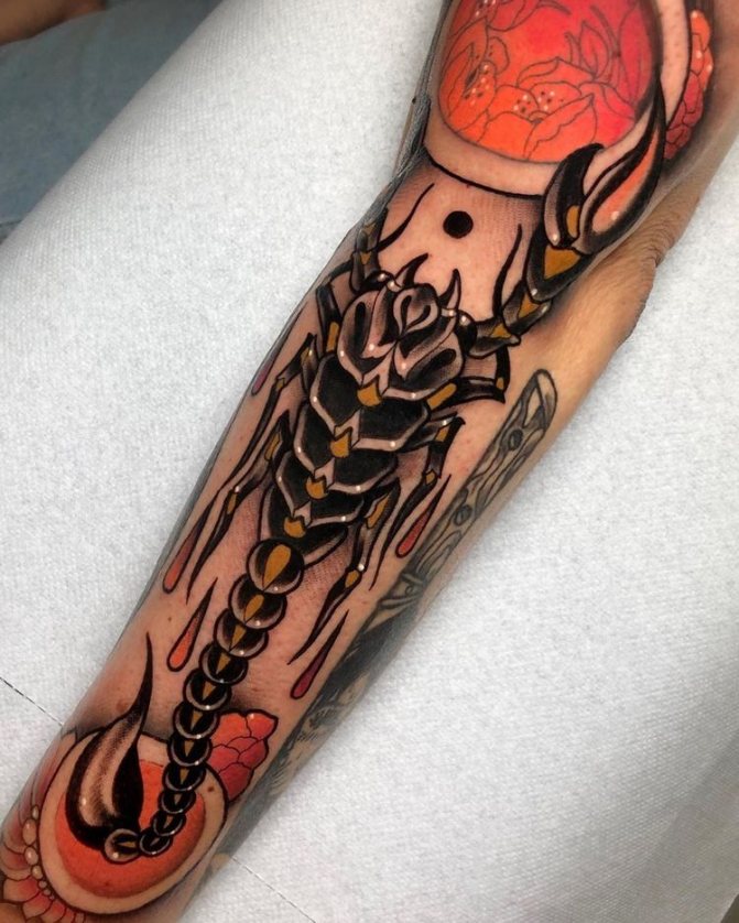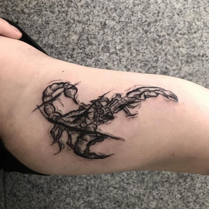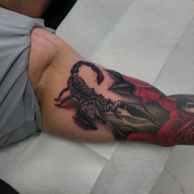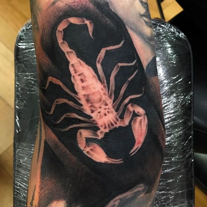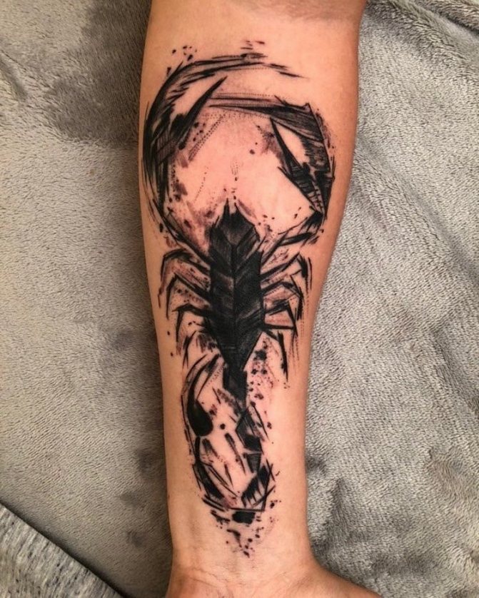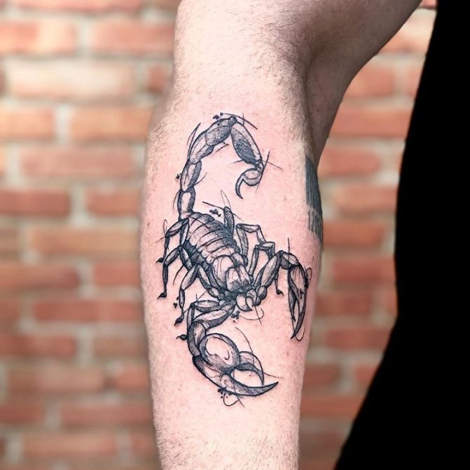 През раните се виждат структурни мускулни влакна, наоколо има зачервяване, а членестоногото, с всичките си нокти и жило, преодолява бариерите под формата на кожни ивици, които му пречат да достигне свободата. Татуировката има смисъл - носителят на изображението свързва личните си качества с качествата на скорпиона, които успява майсторски да прикрие.