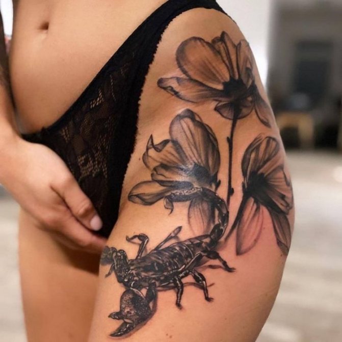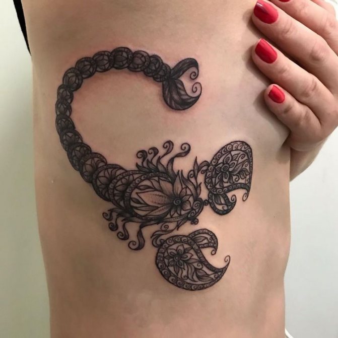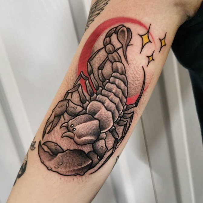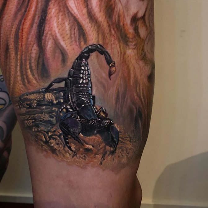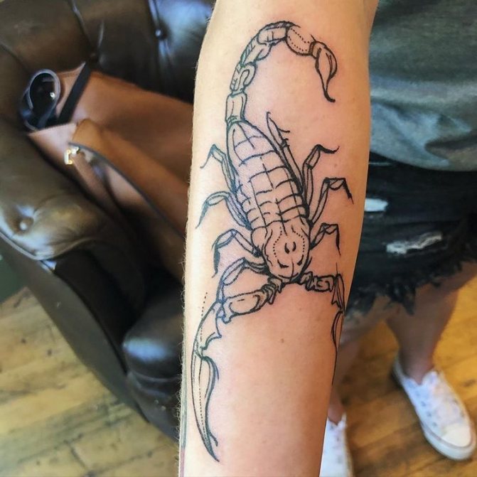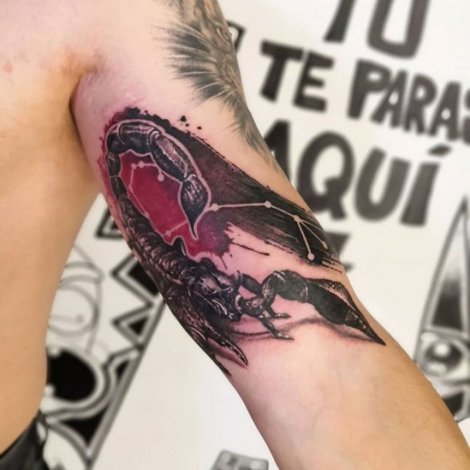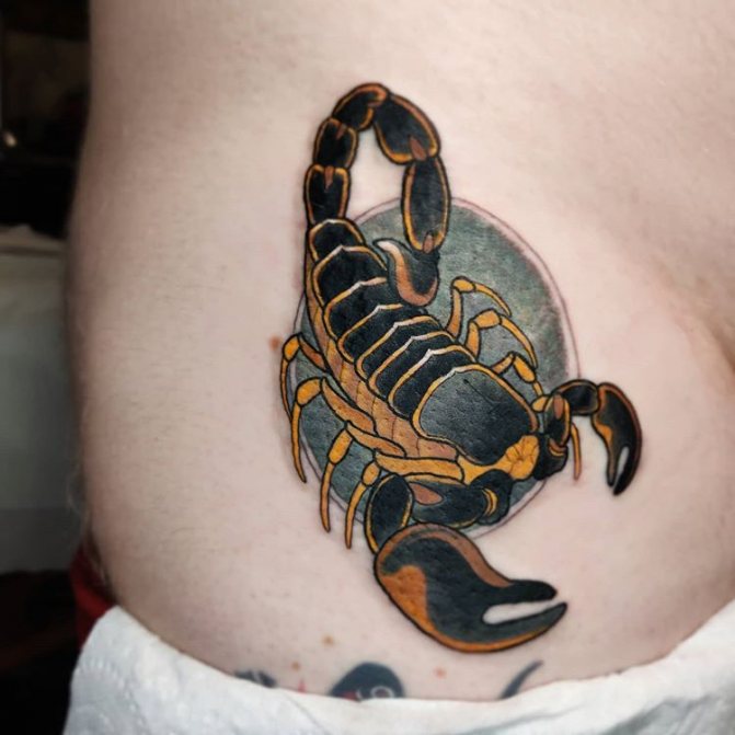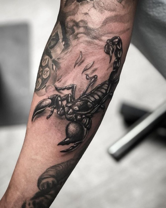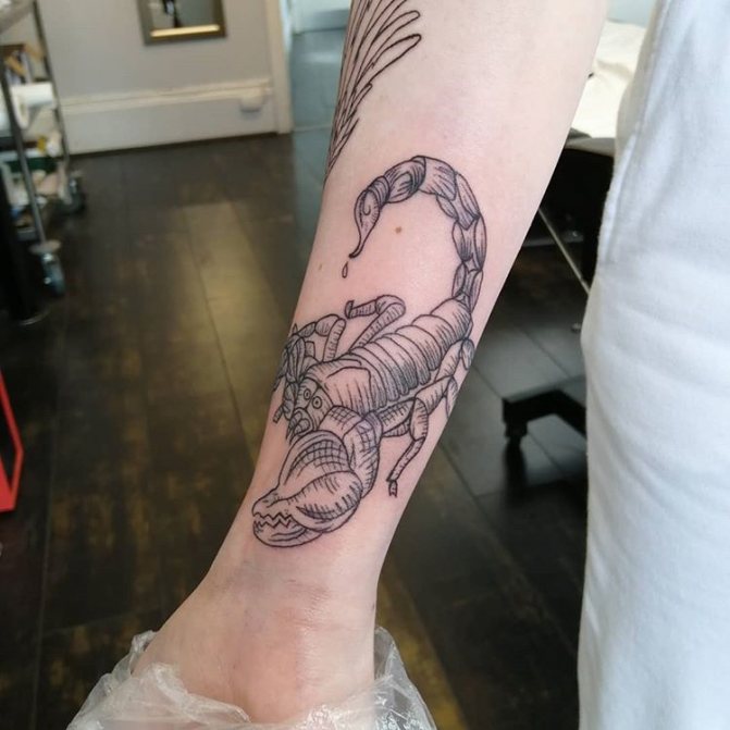 През раните се виждат структурни мускулни влакна, наоколо има зачервяване, а членестоногото, с всичките си нокти и жило, преодолява бариерите под формата на кожни ивици, които му пречат да достигне свободата. Татуировката има смисъл - носителят на изображението свързва личните си качества с качествата на скорпиона, които успява майсторски да прикрие.