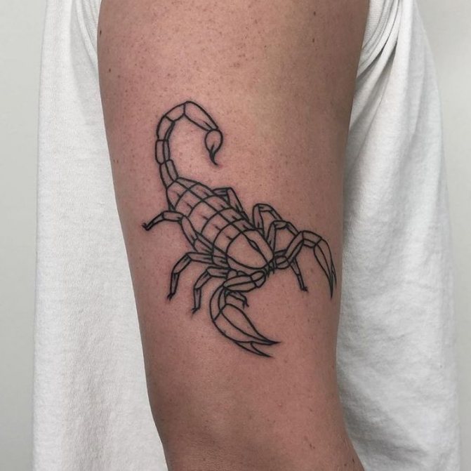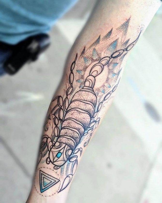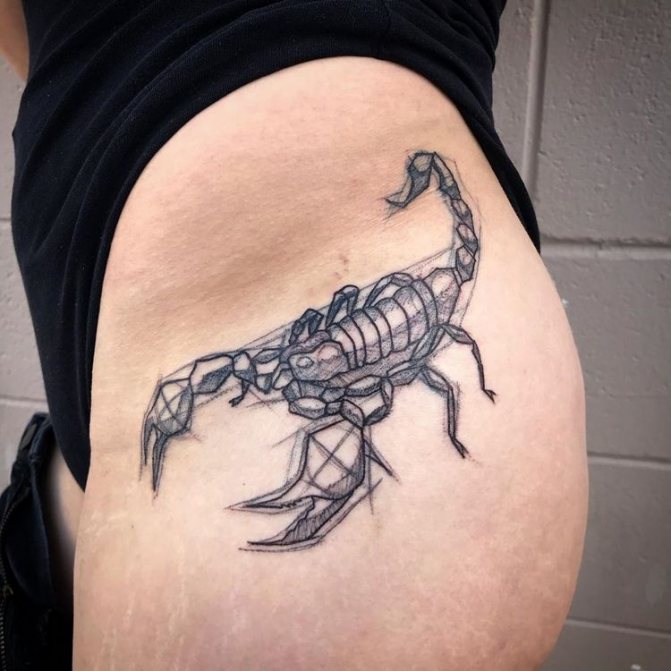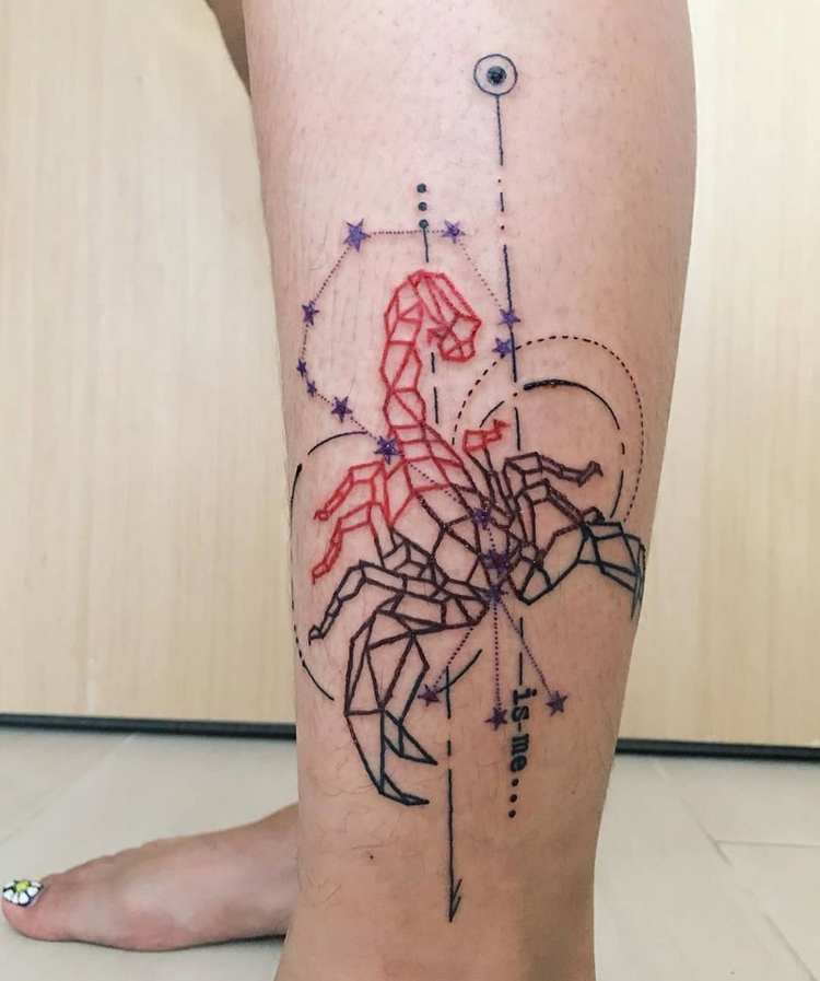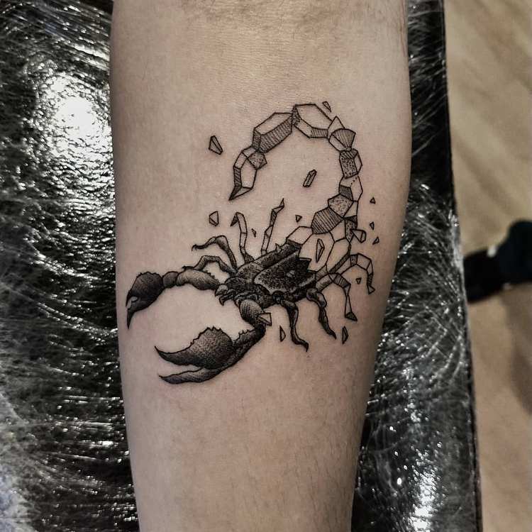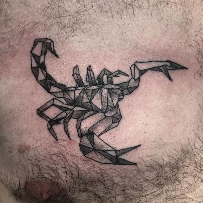 Рядко се среща татуировка на скорпион, вписана в геометрична фигура, обикновено самият обект на изображението се състои от триъгълници, правоъгълници, трапеци и т.н. Или поне половината от него. Геометричните форми визуално оформят тялото му, като го правят да изглежда като груб модел на 3D програмиране.
