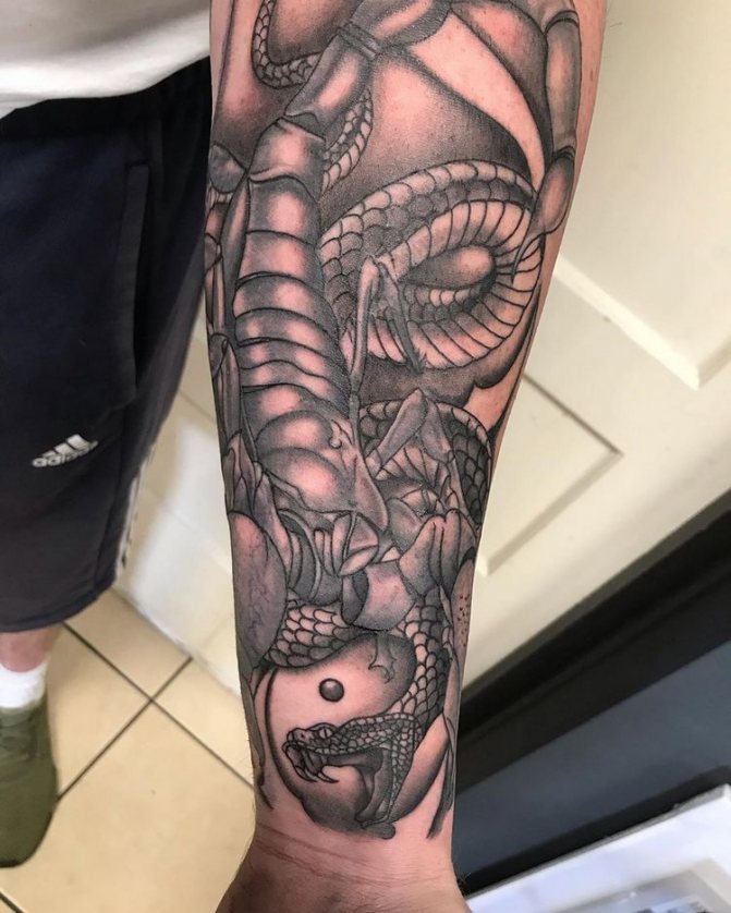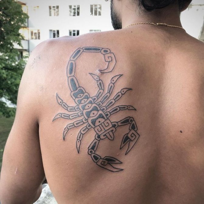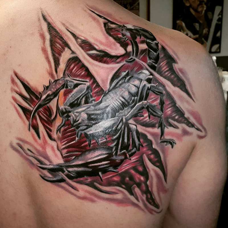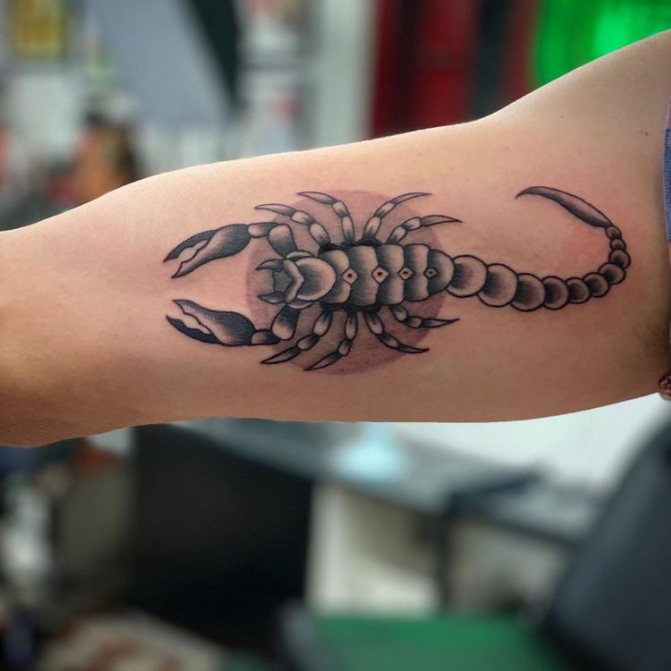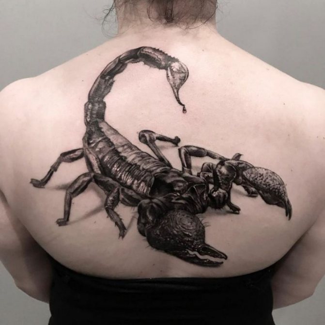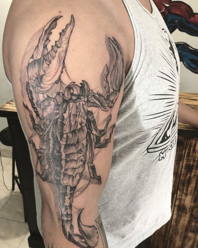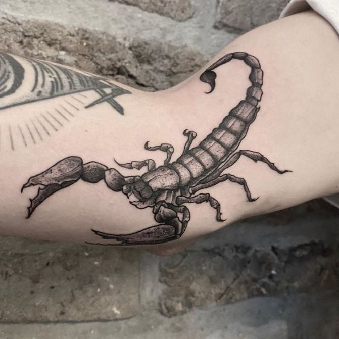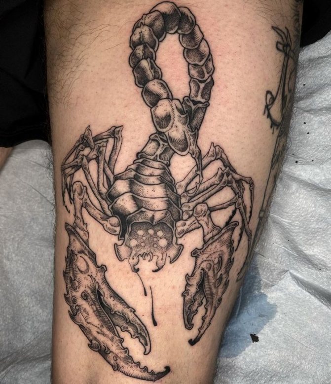 В цялото си великолепие, без никакъв намек за прилика, просто простият стил на реализма отразява цялото величие на смъртоносния скорпион в татуировка, както се казва. Ключовите елементи на татуировката са безмилостно остро жило, готово да удари враговете му във всеки един момент, и два тежки нокътя, снабдени със зъби, наподобяващи пила.