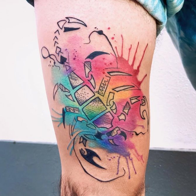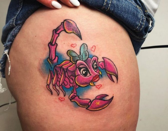 Карикатурният образ на скорпиона предизвиква само положителни емоции. Стилът Newschool напълно неутрализира яда с ярки празнични цветове. Може ли собственикът на такава татуировка да бъде жесток, алчен и алчен? Контурът е черен и удебелен, а иначе главният герой може да бъде нарисуван в какъвто цвят пожелаете.