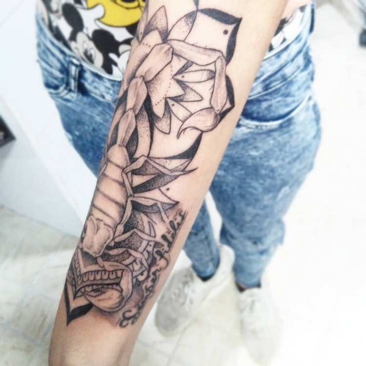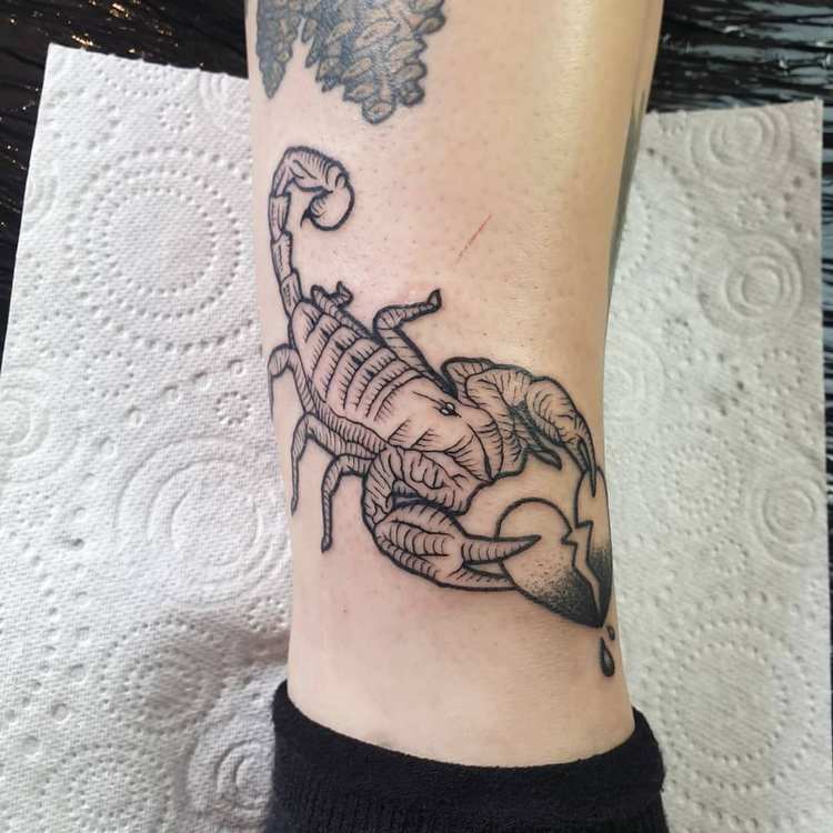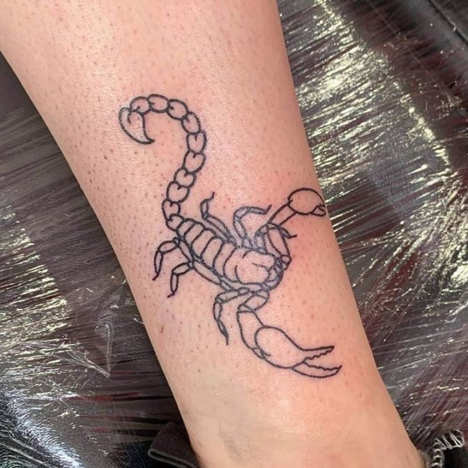 Осемте му крака наподобяват тези на паяк, а два масивни нокътя със съизмерим размер на тялото допълват бойния арсенал на скорпиона. Те, заедно с отровното му жило, са основни елементи на татуировката (и не само това, много игрални индустрии дават на своите роботизирани чудовища тези страховити оръжия, които помитат всичко по пътя си).