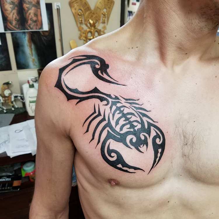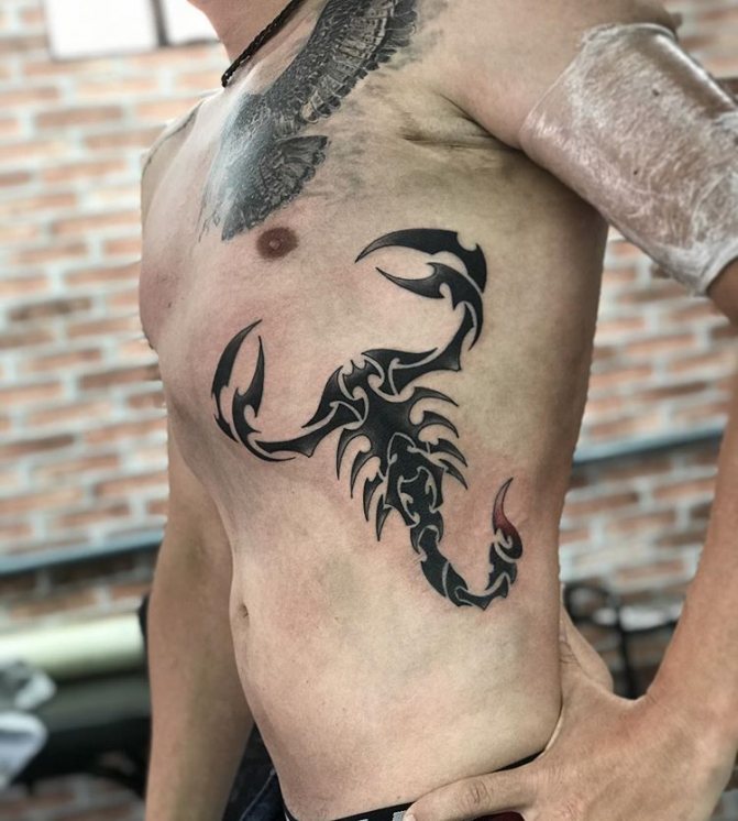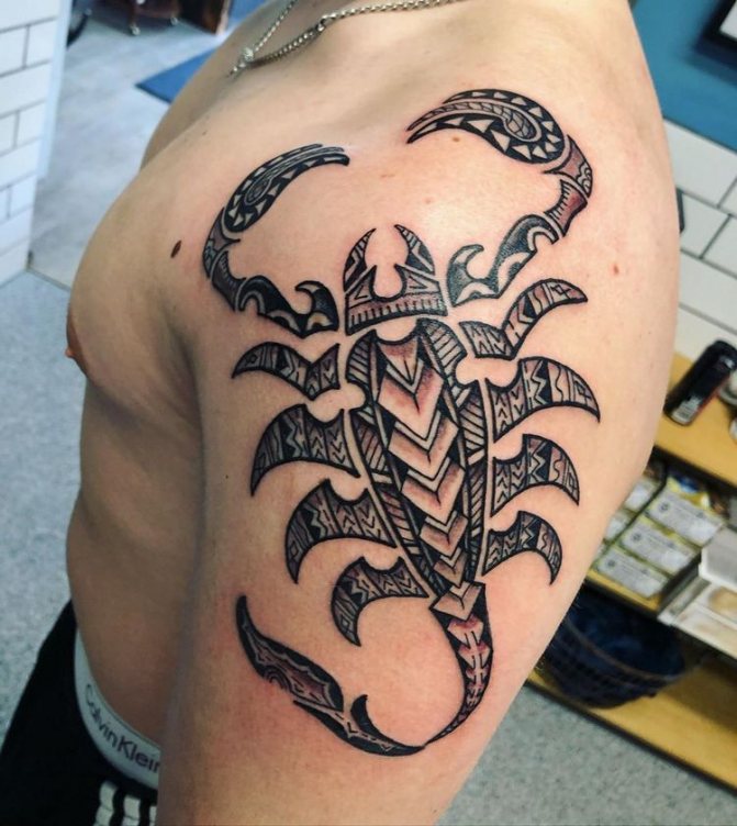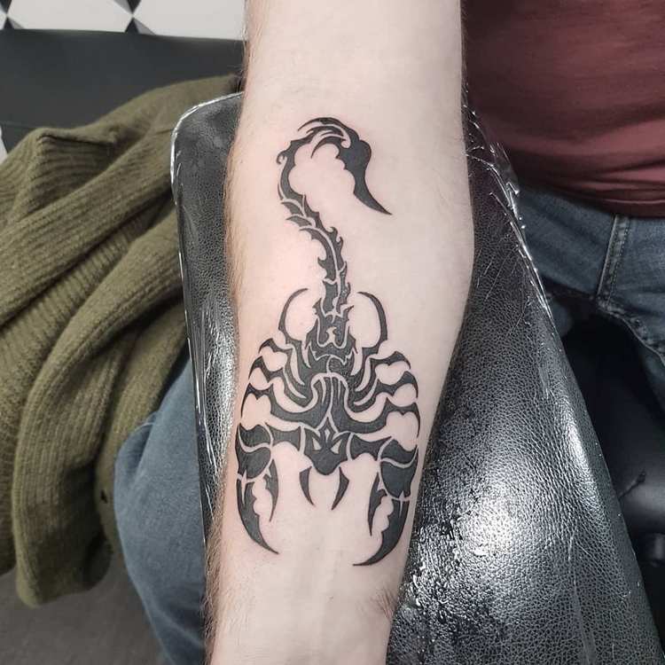 Традиционно татуировките на скорпион в племенен стил са изцяло черни, но има и изключения под формата на различни ниши, вдлъбнатини и т.н., които са много популярни днес. Единственото нещо, което не се променя с течението на модата, е имиджът. Това е идеята за татуировка, състояща се от няколко части, чиито краища се стесняват.