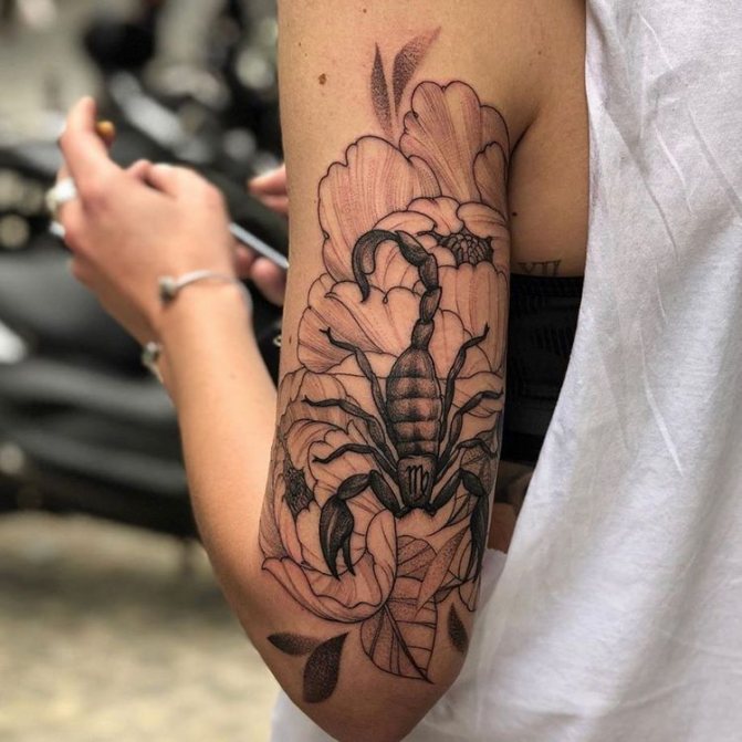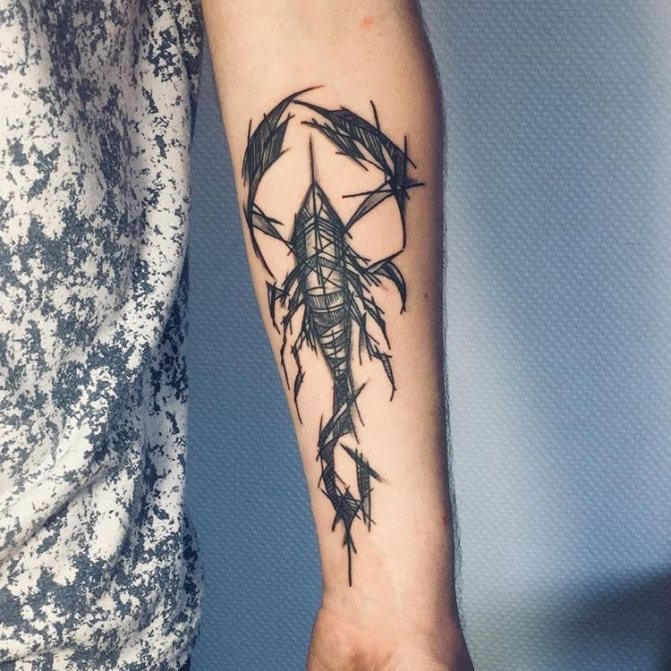 Зашеметяващото внимание към детайлите прави татуировката Scorpio Graphic уникална, истинско произведение на изкуството на тялото. Цветовата база се състои от комбинации от черно, сиво и понякога бяло. Работата трябва да прилича на обикновена рисунка, направена с оловен молив - плоска, въпреки наличието на сенки и специално подчертани фрагменти - светлосенки.
