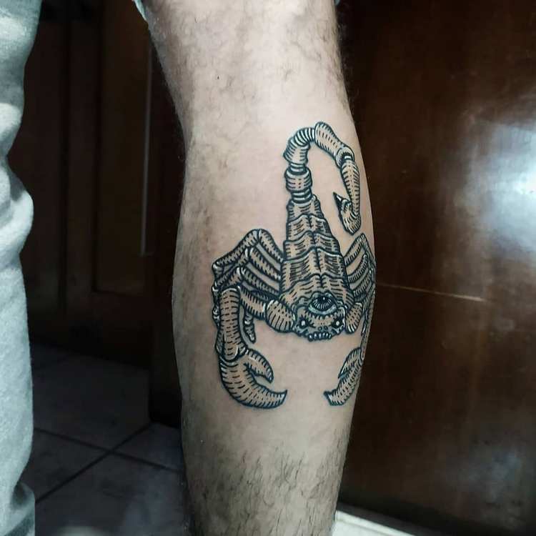 Общото между татуировките Scorpion Gravure е особеният начин, по който е представено изображението. Той се състои изцяло от линии, но се различава от стила Linework по това, че всички контури и сенки са с еднакъв размер. Да, сенките също са паралелни удари - тирета, това е ключовата характеристика, която прави татуировката да изглежда като отпечатъци от средновековни илюстрации.