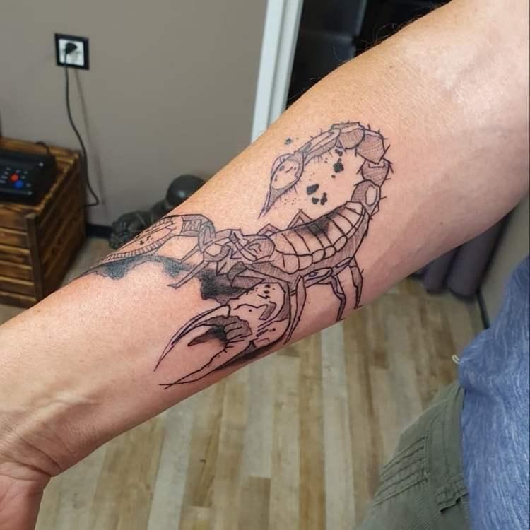 Работата върху изображение на скорпион за бъдеща татуировка, след което оставя работата недовършена, е същността на стила "Скица". Илюзията за неизказаното, неизразеното, недовършеното е основна характеристика на стила. Татуировката Скорпион в стил скица представлява точно пренесена скица на татуировката върху тялото на клиента с координирани линии и бързи движения. Какво можеш да направиш, когато целият свят е несъвършен.