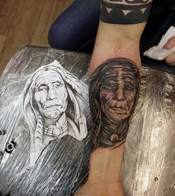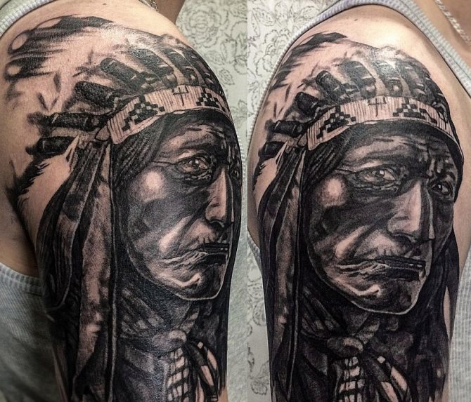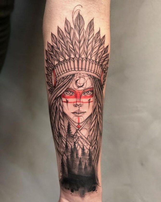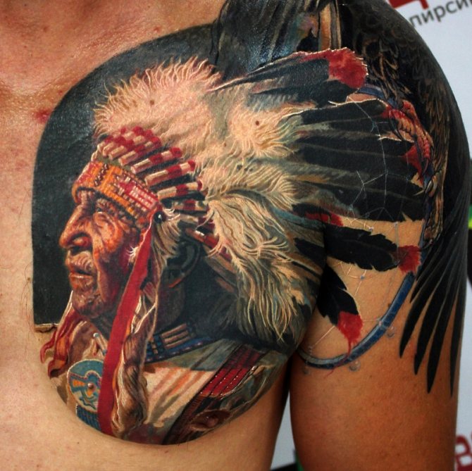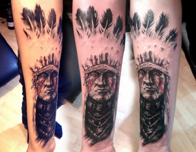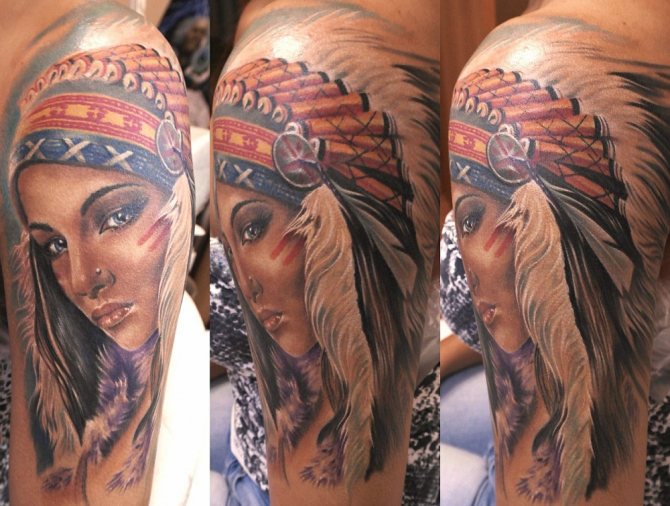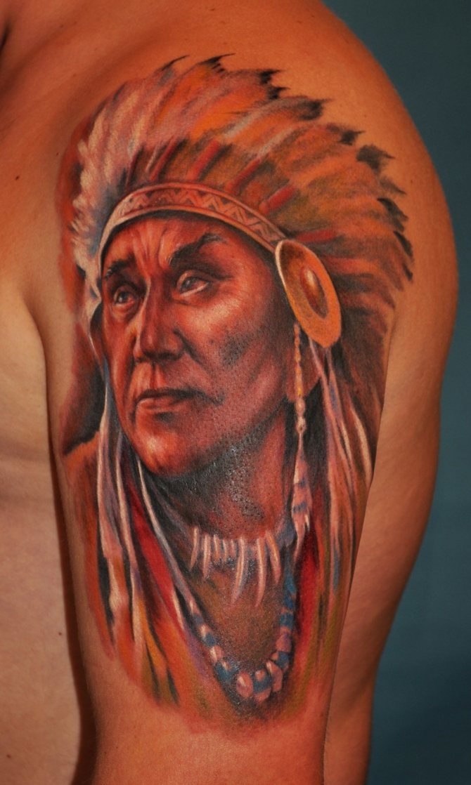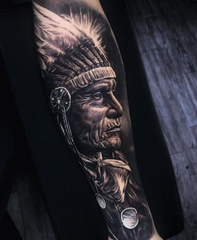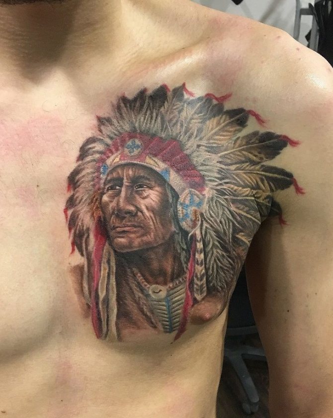 Татуировката с първия жител на Северна Америка символизира почитта към традициите и уважението към предците. Символиката на индийската татуировка е израз на почит към традициите и уважението към предците. Индиецът, като древен жител, представлява сила, способност да се справя самостоятелно с трудностите на живота и да взаимодейства с елементите на Вселената.