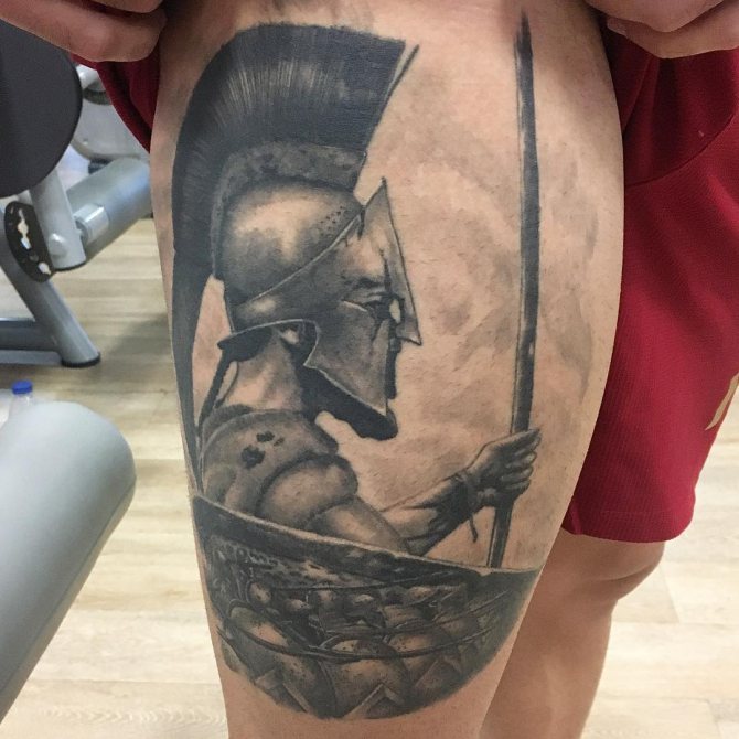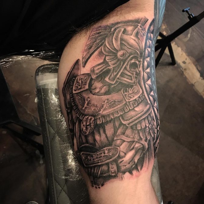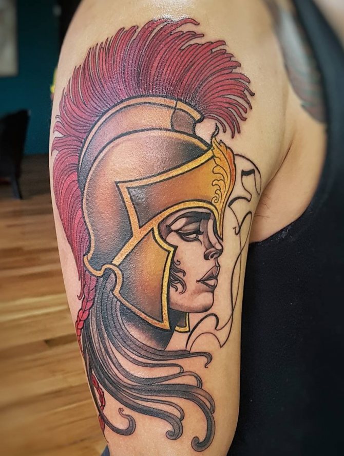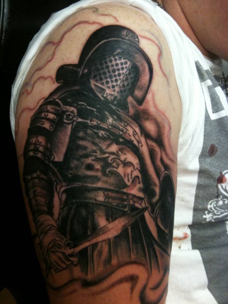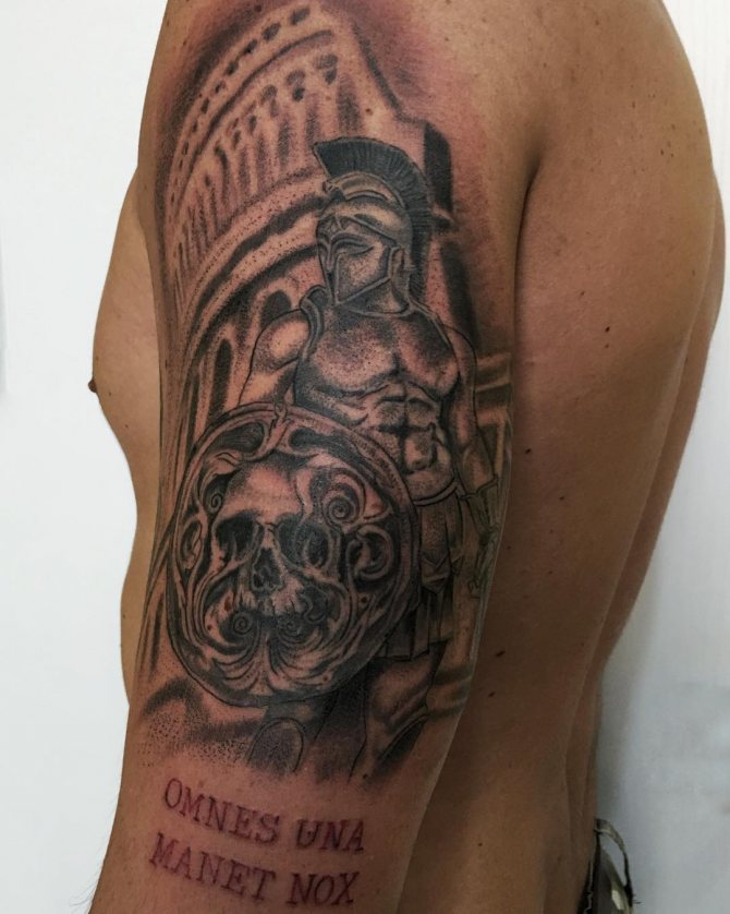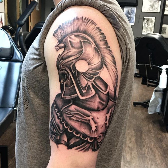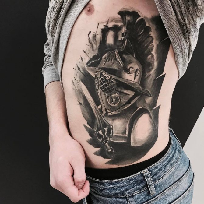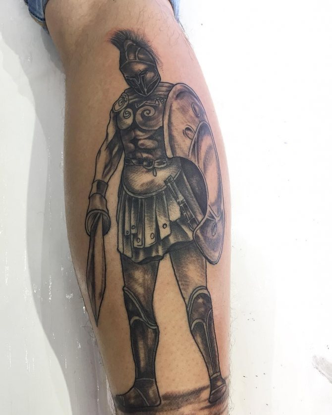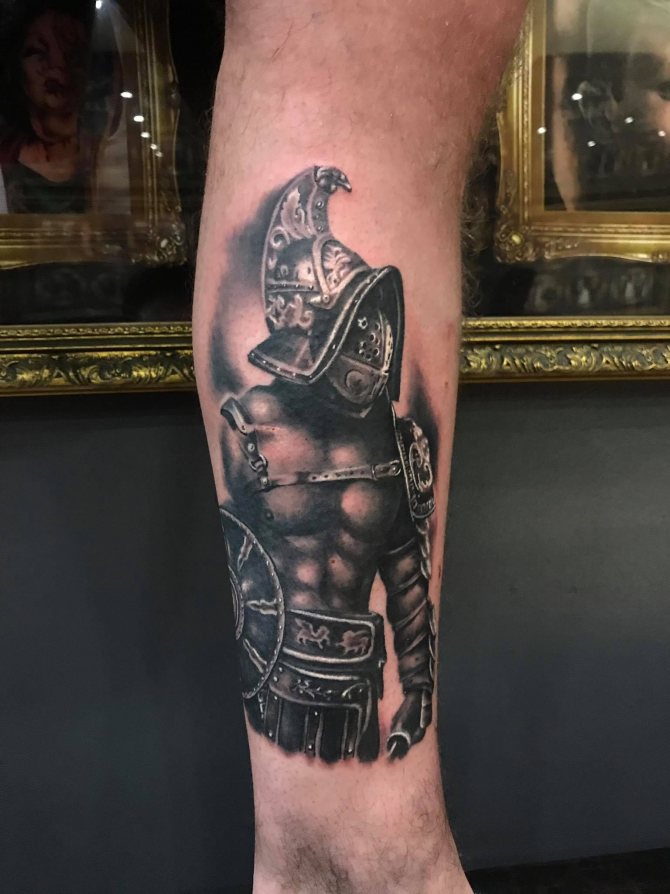 Татуировка на гладиаторски доспехи с шлем, раменни възглавници и щит ще действа като талисман, когато се постави върху предмишницата или стъпалата на краката.