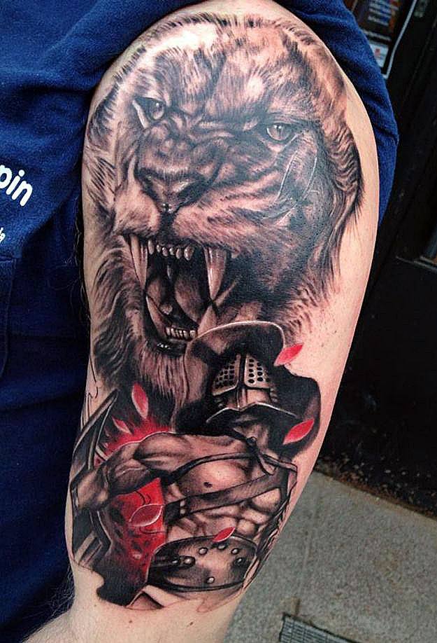 Татуировка на гладиатор с лъв е също толкова впечатляващ пример за гладиаторска татуировка. Сред най-често срещаните варианти е рисунка на уморен и ранен гладиатор, величествено застанал над победено животно, което символизира победата. Много впечатляващи са и скиците, изобразяващи моменти от битката между безстрашен воин и свиреп хищник. Подобни скици могат да символизират вечната борба на вътрешните чувства и емоции на притежателя и неговото отричане на случващото се.