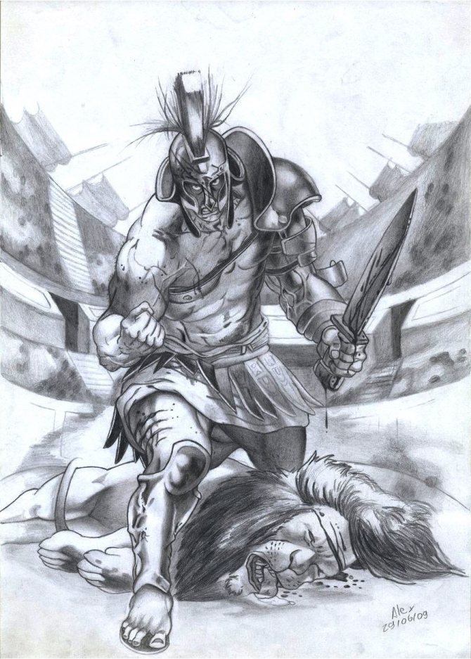Скиците на гладиатор с татуировка на арената често показват момента на сблъсъка с врага и в зависимост от избраната техника могат подробно да предадат състоянието и действията на участниците в двубоя. Такива картини се характеризират с множество свързани детайли. Съществуват и скици, на които гладиаторът е изобразен на арената преди или след битката. Такива рисунки могат да означават стремеж към победа и безстрашие, или пък известна обреченост и надежда.