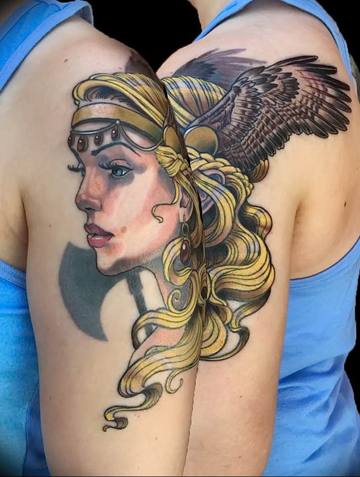 Образът на русокосата красавица-войн ще изглежда впечатляващо в техниката на реализма. Детайлите, играта на сенките, богатата цветова палитра, различните нюанси придават на татуировката специална енергия (вж. снимката в галерията). В зависимост от предпочитанията ви татуировката може да бъде цветна или черно-бяла. В последния случай дизайнът ще изглежда като илюстрация от средновековна книга. Цветната скица за татуировка обикновено се избира от представителките на нежния пол.