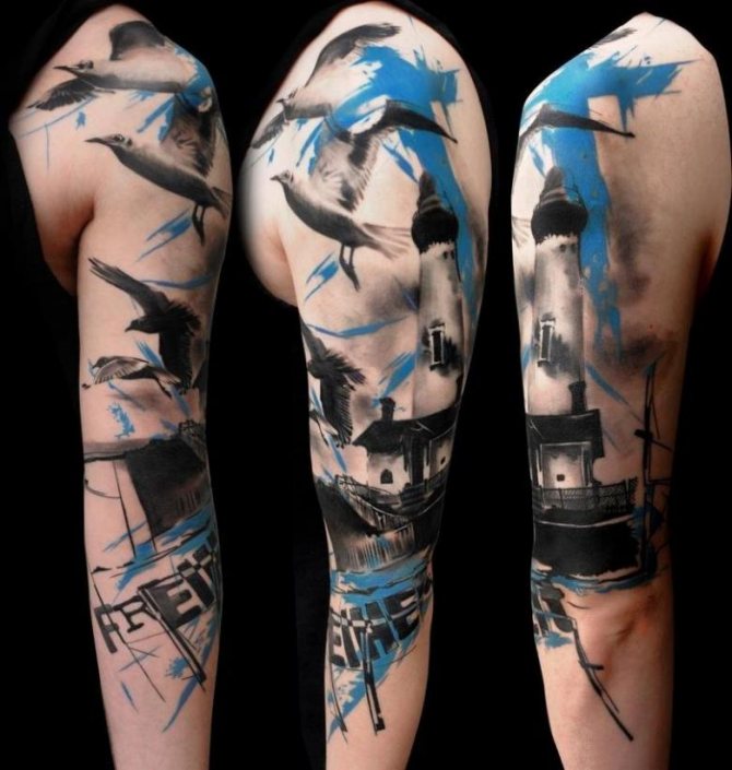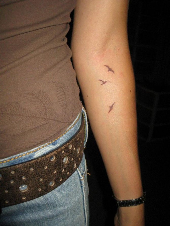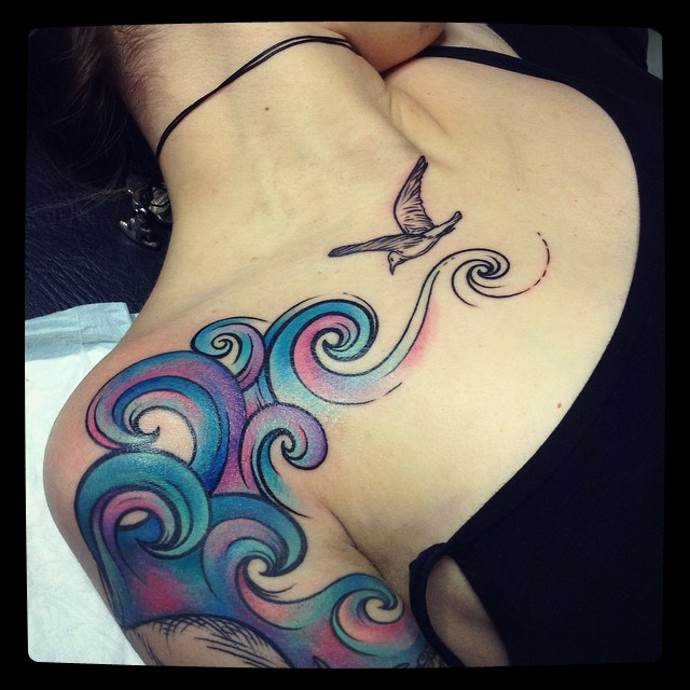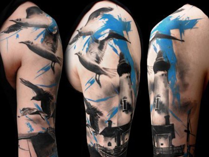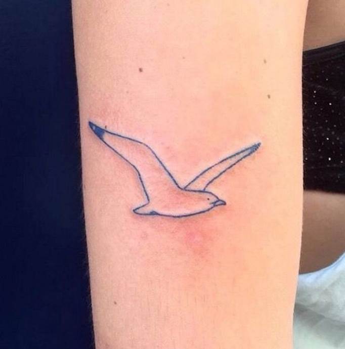 Същото може да се каже и за акварелната татуировка. Същото може да се каже и за акварелните татуировки - тенденция, предпочитана от дамите заради деликатността и ефирността на дизайна. Чайката, рееща се над морето, е любима тема. Той може да се носи на ръката, гърба, предмишницата или ключицата. Миниатюрна татуировка на китката ще подхожда и на представителките на нежния пол и ще подчертае тяхната крехкост и красота.