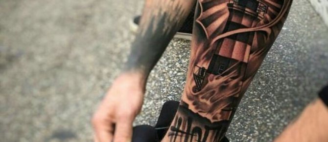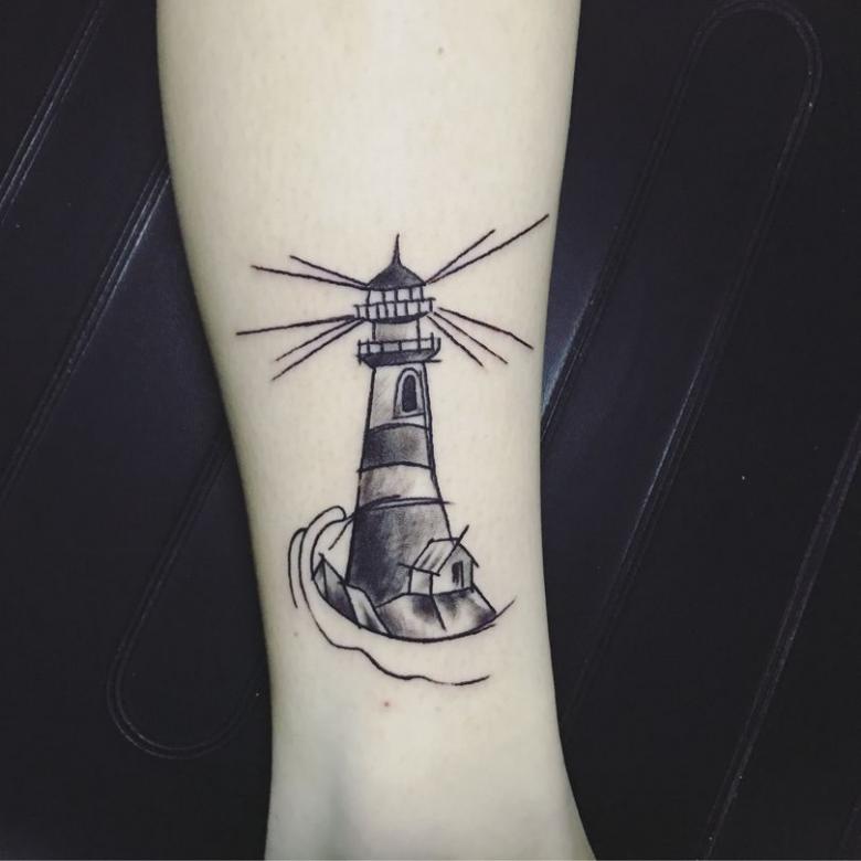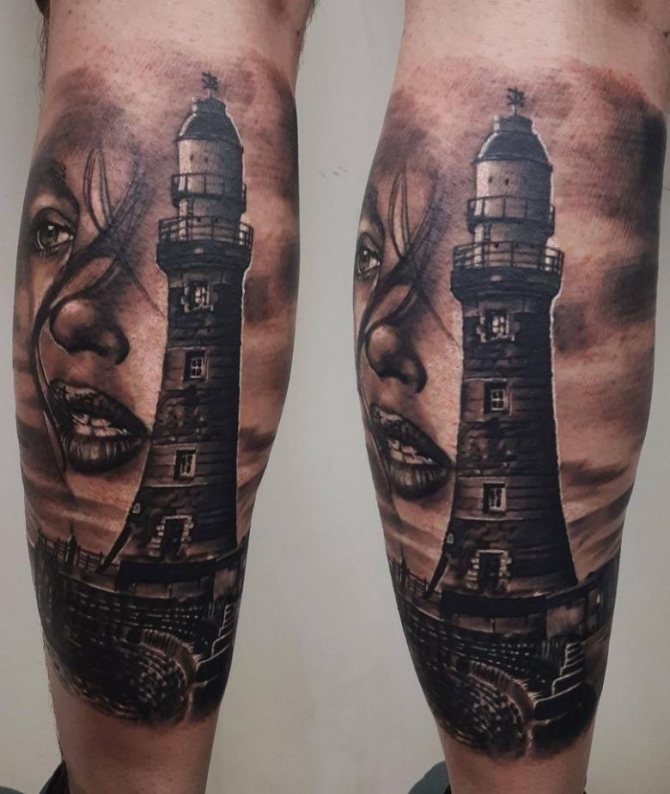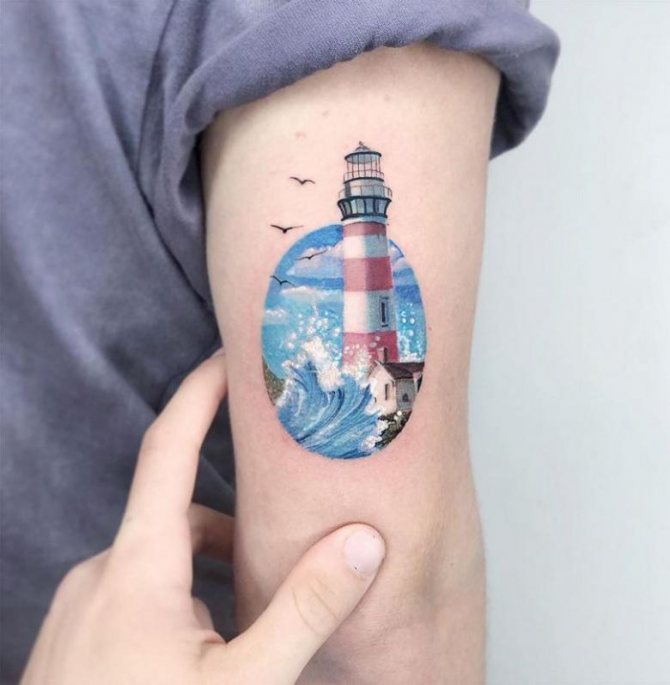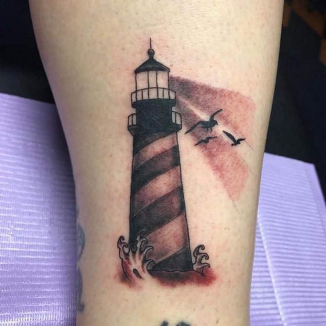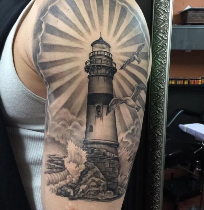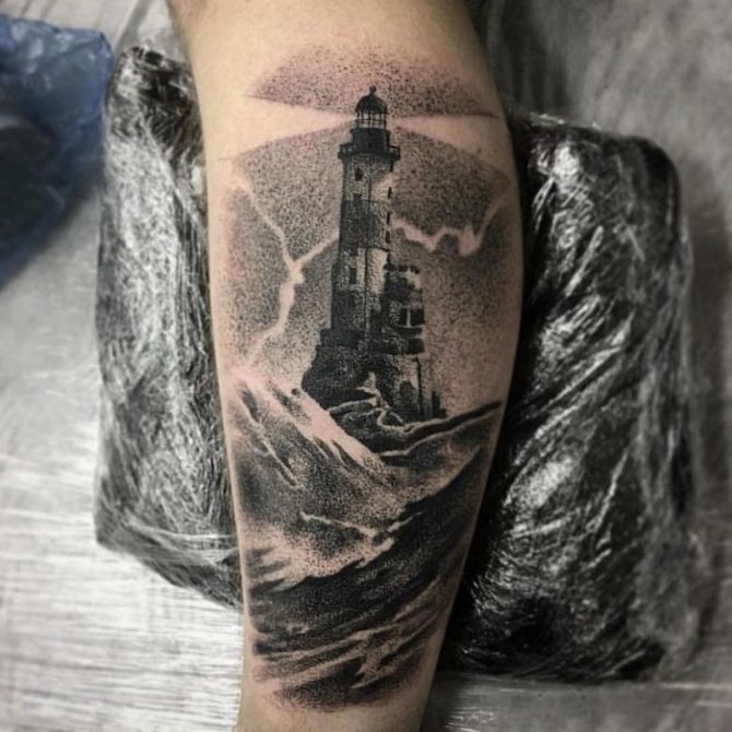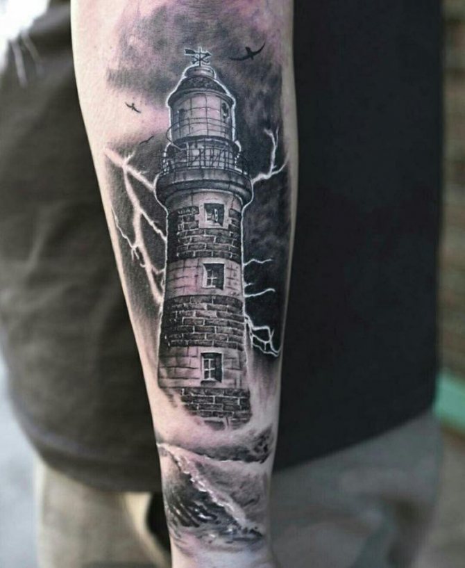 По правило скицата на татуировката на фара е много ефектна и още отдалеч привлича вниманието на околните. Това е татуировка на фар със сноп ослепително ярка светлина, която се излъчва от кулата на фара, извисяваща се високо над скалите, на фона на черни облаци и пенести вълни, и можете да разберете защо това изображение е толкова пленително за мнозина.