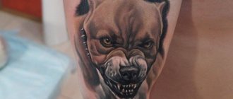 - Питбул - собственикът на такава татуировка трябва да има голяма физическа и психическа сила. Това е и популярен образ сред притежателите на тази порода кучета. При избора на скица се дава предимство както на пълното изображение на кучето, така и на изображението на главата му. Куче, нарисувано в карикатурен стил, е знак за доброта и искреност и показва любовта на човека към домашния му любимец.