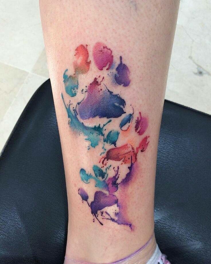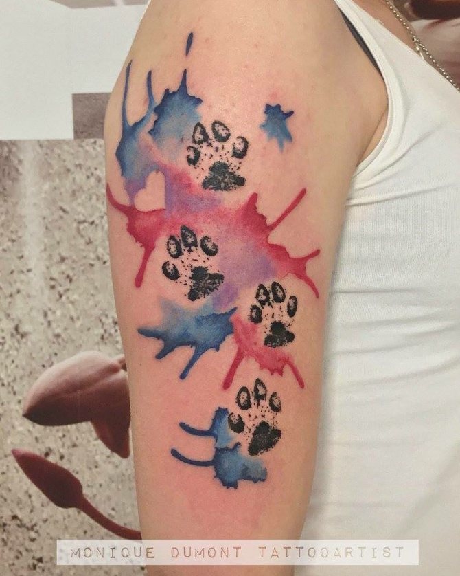 Често към името на кучето просто се добавя снимка на отпечатъка от лапата на кучето или самият отпечатък от лапата на кучето. Това е чудесен вариант за тези, които не искат напълно детайлна татуировка на куче, но искат да почетат домашния си любимец по всякакъв възможен начин.