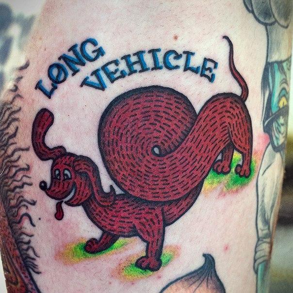 - Карикатура. Често върху тялото се създават анимационни герои на кучета. Те ще подчертаят вашата позитивна, леко детска личност.