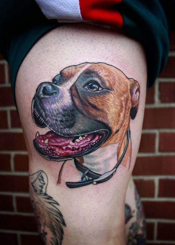 Тук вече се обръща внимание на въображението на собственика на кучето, то може да бъде като картина на куче под формата на абстракция или портрет на четириног приятел с неговото име. В повечето случаи се татуира само главата на кучето. Този тип татуировка се отличава с огромните си очи, надвисналите бръчки и изрязаните уши. Татуировката от този тип изглежда доста сурова и строга. Често татуировките с питбул намират своите мъжествени собственици. Обикновено изображенията с питбули се рисуват върху гърбовете, раменете на мъжете и оставят незабравимо впечатление, защото картината е изобразена като голяма, което предизвиква определена емоция.