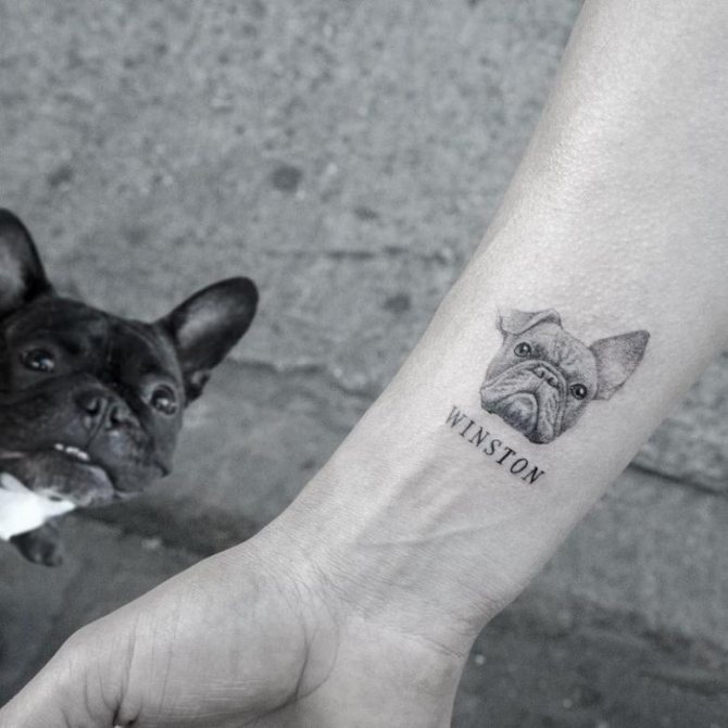 - Минимализъм. Можете да направите само контур на едно или две кученца. Сладка и нежна ще изглежда такава татуировка на китката на момиче.